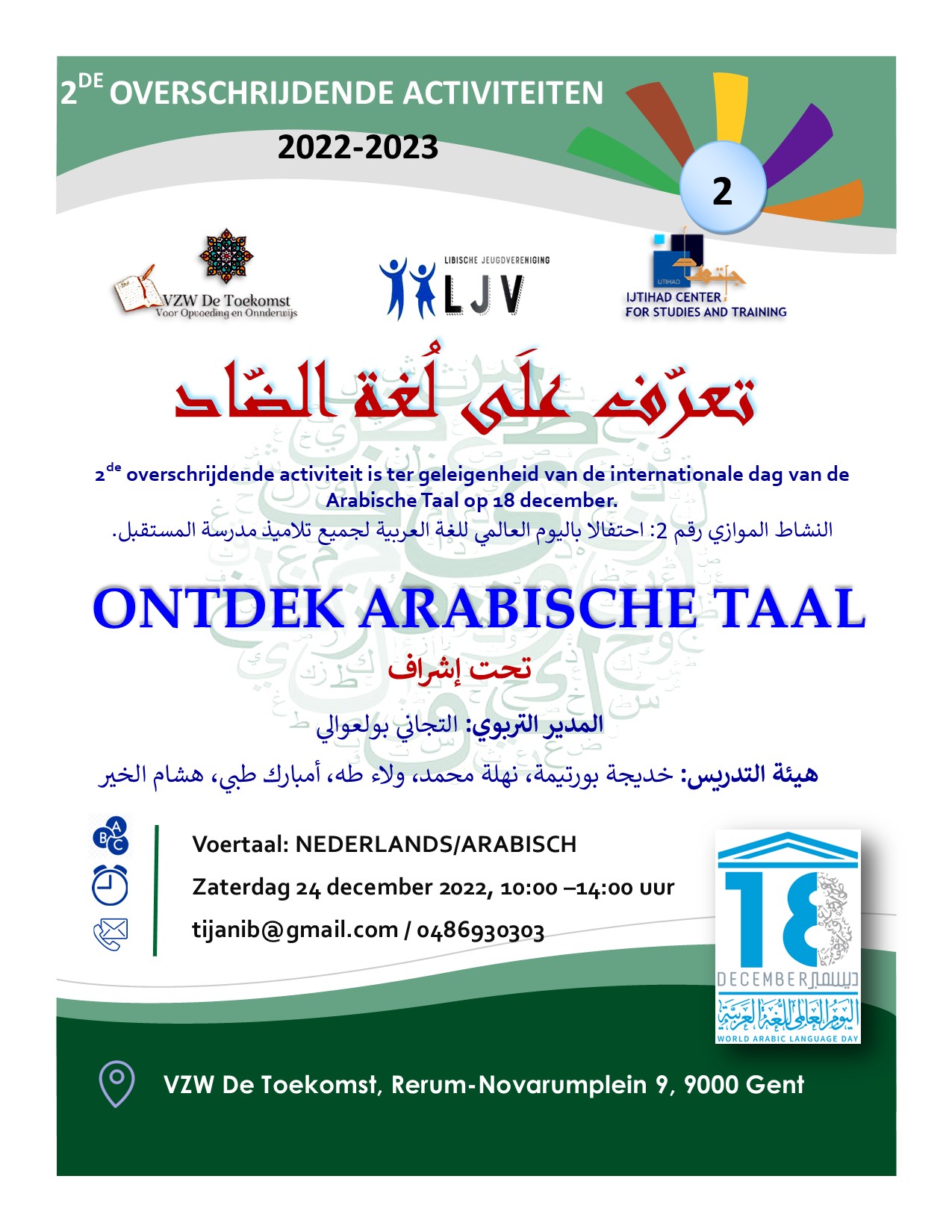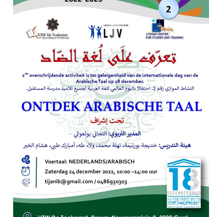 Ijtihad Center for Studies and Training, in cooperation with Al-Mustaqbal School and the Libyan Youth Association, organized an introductory day for children under the title: Discover the Arabic Language, on December 24, 2022, on the occasion of International Arabic Language Day. This event included a range of activities, such as writing, drawing, coloring, and documentaries about the Arabic language.