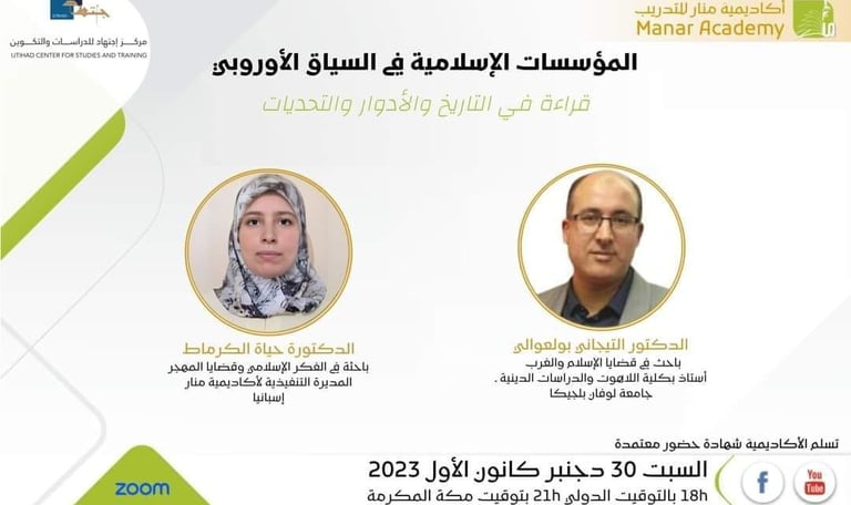 In samenwerking tussen de Manar Academy for Training in Spanje en het Ijtihad Center in België werd op 30 december 2023 een lezing georganiseerd met als thema: De islamitische instellingen in de Europese context: geschiedenis, rollen en uitdagingen. Deze lezing werd gegeven door dr. Tijani Boulaouali en werd bijgewoond door 116 mensen.