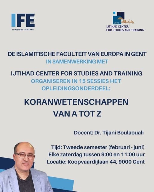 In cooperation between the Ijtihad Center for Studies and Training and the European Islamic College in Ghent, the module “Qur’anic Sciences from A to Z” was organized. This course was given in 15 lectures, in the Dutch language, between February and June 2024. The lecturer Dr. Tijani Boulaouali discussed in this module various sciences and topics of the Qur’an, such as the history of the Qur’an, the revelation, the reasons for the revelation, the abrogation, the inimitability of the Qur’an, and others.