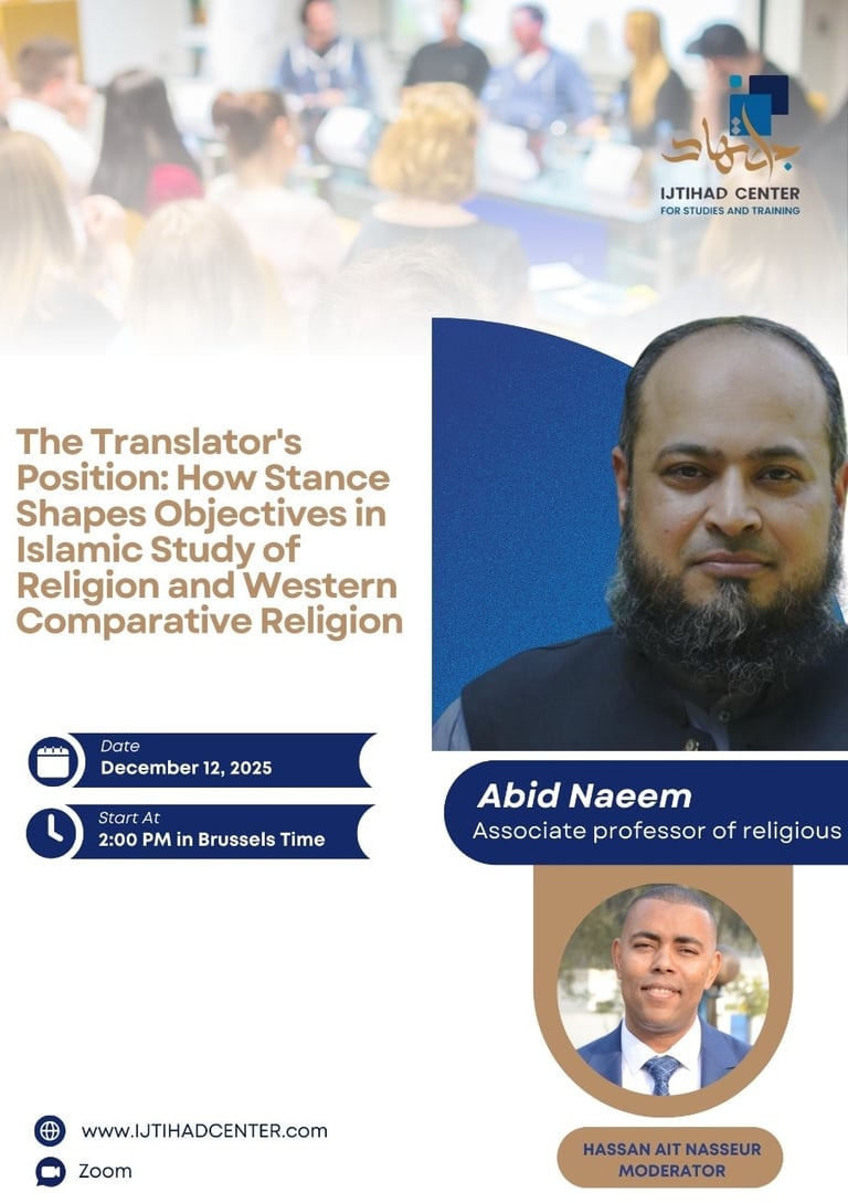 The Ijtihad Center for Studies and Training, in coordination with the Translation and Religion Unit, is organizing an academic lecture in English entitled: The Translator's Position: How Stance Shapes Objectives in Islamic Study of Religion and Western Comparative Religion ️ “The Translator’s Position and Its Role in Shaping Research Objectives in Islamic Studies and Western Comparative Religion”